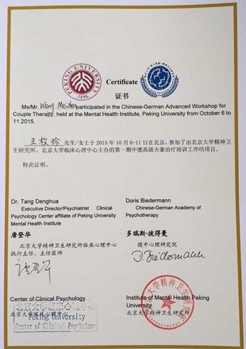 教师特色:两位德方老师均为“中德五期”治疗师培训项目的老师,他们在夫妻治疗届享有盛誉,他们长期为世界不同机构进行督导和教学工作,他们创造性、整合的授课风格颇受业界人士的欢迎。同时我们还配备教学和临床经验丰富的中方教师和中方助教,从而最大程度保障教学效果。中方教师之一唐登华老师是北京大学临床心理中心常务副主任, 中国心理卫生协会大学生心理咨询专业委员会副主任委员,中国心理卫生协会团体心理辅导与治疗专业委员会副主任委员,他也是历届中德家庭培训项目的资深中方教师,不仅教学和临床经验丰富, 而且深受学员爱戴。
