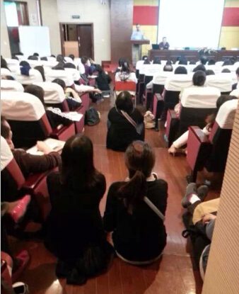 没有抢到座位的老师只能够坐地板听课