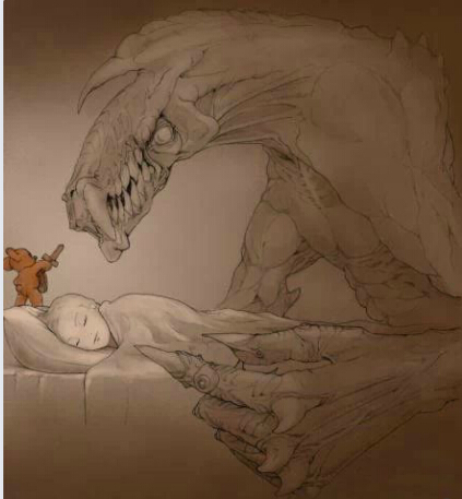 图中的这个宝宝梦见了可怕的怪物,可是因为有过渡客体毛毛熊,宝宝可以继续安然入睡。宝宝给这个毛毛熊赋予了很多自己希望得到的力量、勇气和安全感